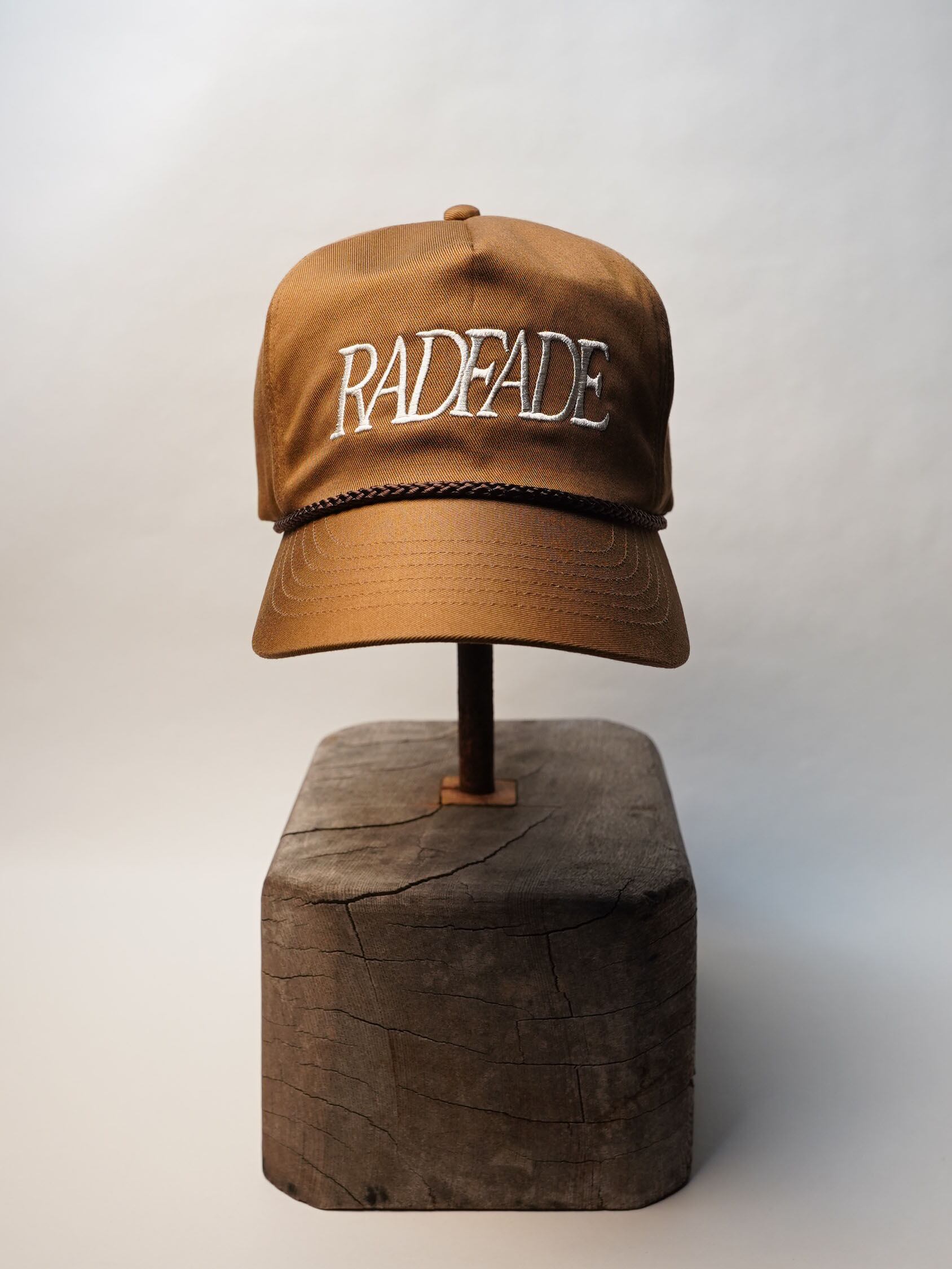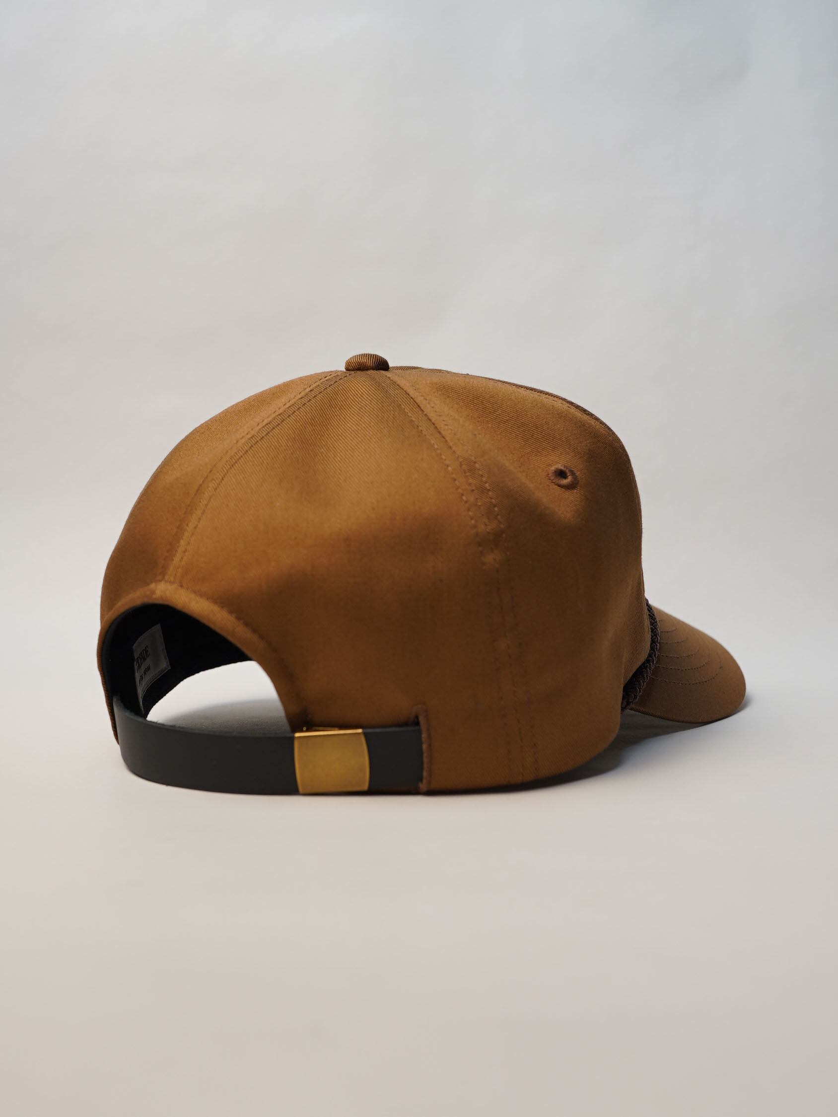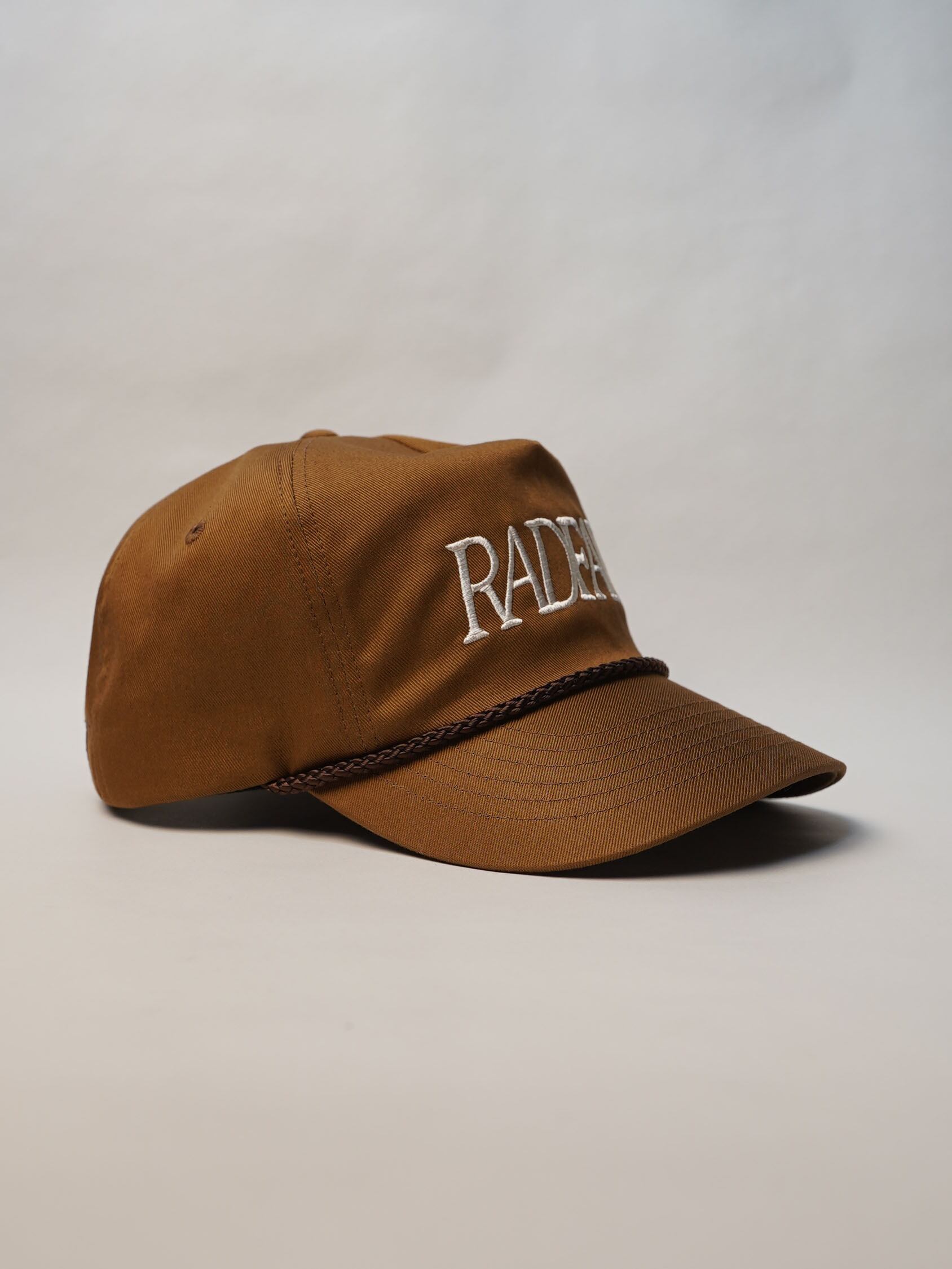 独自に型から制作したRADFADEオリジナルの5パネルキャップを使用しており、トラッカーキャップの力強さを持ちながらも、頭の形にすっと馴染むバランスの良さが特徴です。